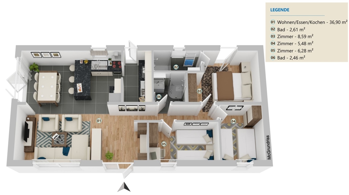 • Der barrierefreie Bungalow Naturpur ist ein echtes Zuhause, er beeindruckt mit elegantem Design, großzügigem Raumkonzept und durchdachter Funktionalität. Ein geräumiger Salon lädt zum Entspannen ein, während komfortable Bäder und eine voll ausgestattete Küche höchsten Wohnkomfort bieten.